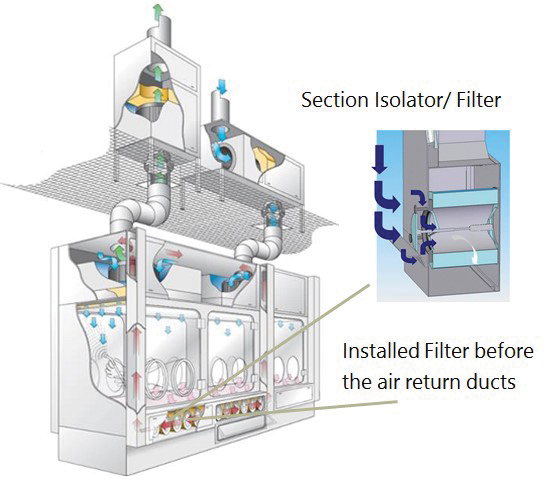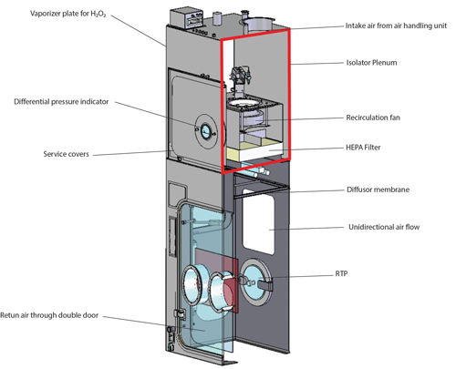 An HPAPI isolator, on the other hand, features an additional filter level before the air return into the isolator plenum. This filter level is located directly before the air return ducts, preventing HPAPIs from spreading into return air ducts and the isolator plenum. See Figure 2 for a single-wall isolator with appropriate filter technology between the isolator process chamber and the air return ducts for use with HPAPIs (2).