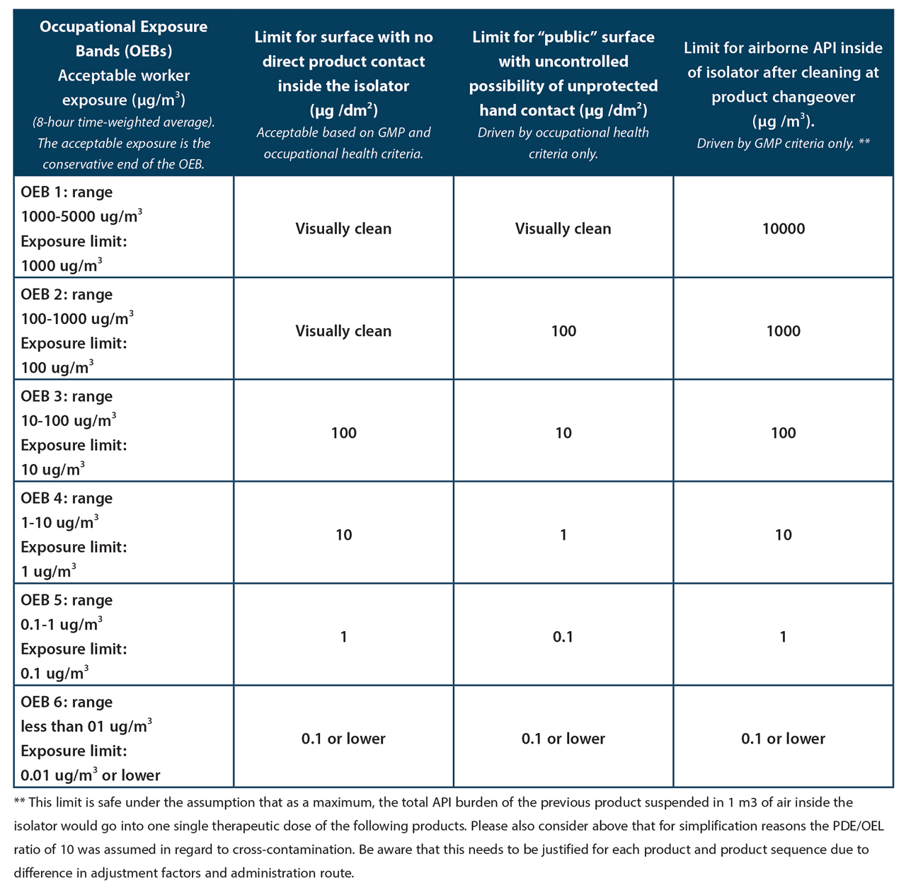 It is proposed that this level of cleanliness should, in the majority of cases and after due consideration of exact circumstances of the individual situation, also suffice for GMP. It means that the whole contamination on 1 dm2 of inside surface of the isolator would have to be transferred into one single daily dose of the next product to cause a patient risk issue. We would like to suggest that this scenario is so unlikely that it can be safely assumed that it will never be exceeded in reality. Where one PDE per dm2 would represent a level of contamination that would still be visible (PDE of several 100 µg /day), the minimum requirement would of course be the one of visual cleanliness (cf. Table 1. Proposed EH&S and GMP surface limits for non-product contact surfaces and air limits inside of isolators).