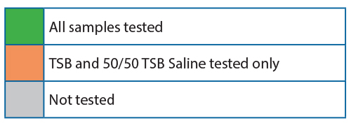 A 50:50 Tryptone Soya Broth (TSB): saline mixture was prepared to represent a worst-case product, as it would provide a more challenging environment than is typically observed for drug products, should a product supporting microbial proliferation be included in a clinical protocol.