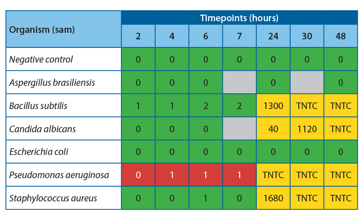 Samples were prepared and were inoculated with a target inoculum level <100CFU/100mL “product”. The organism panel included Staphylococcus aureus, Bacillus subtilis, Pseudomonas aeruginosa, Escherichia coli, Candida albicans and Aspergillus brasiliensis. These were selected to represent the range of flora that may be observed during preparation: human skin commensal, common environmental isolate, waterborne organism, and environmental yeasts and moulds. The organisms also represent the range of microorganisms within the environment: Gram-positive cocci, Gram-positive spore-forming rods, and Gram-negative bacteria.
