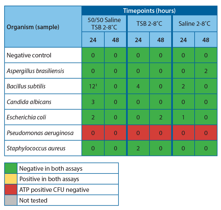 The inoculated bags and bottles were then incubated at 2-8˚C and 20-25°C. Samples were tested at intervals over 48 hours using both ATP bioluminescence and traditional pour plate techniques.