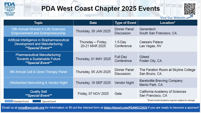 The PDA West Coast Chapter (PDA WCC) plays a vital role as the premier organization for the San Francisco Bay Area's biopharma industry professionals. The PDA WCC was founded 35 years ago in 1989, with its mission of connecting people, science, and regulation. We strive to promote and enhance knowledge within the sciences and technologies, develop programs and other activities designed to meet local and/or global needs consistent with PDA's mission and objectives.