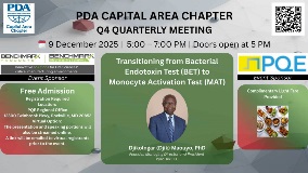 Join the PDA Capital Area Chapter for our Q4 Quarterly Meeting on Tuesday, December 9, 2025, hosted at PQE in Rockville. This free event brings together students, early career professionals, and industry experts for an evening of learning, networking, and professional growth. Food and beverages will be provided, catered by CAVA.