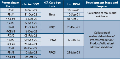 Tables 1 and Table 2 depict the recombinant factors' date of manufacture (DOM) and rCR product DOM to capture the stability of recombinant factors, manufacturing variability of recombinant factors and finished products. The recombinant factors, rCR vials and cartridges lots were manufactured on different days. Each PPQ lot was manufactured using three unique (nine total) lots of recombinant factors. All rCR vial and cartridge lots tested met the acceptance criteria, indicating that recombinant factor lots were stable over time and that the manufacturing process variability was well controlled.