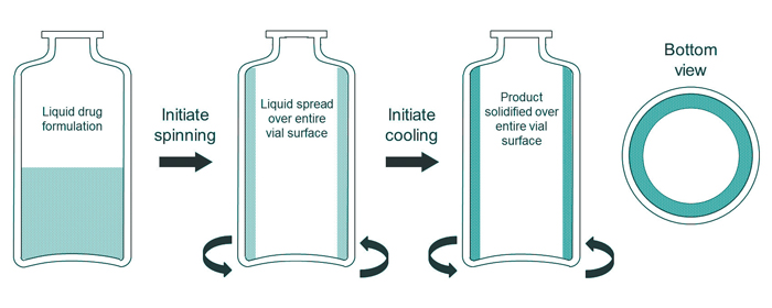 At the start of the continuous freeze-drying process, sterile glass vials are aseptically filled with the aqueous drug formulation before they are transferred to the freezing unit. In the freezing unit, the vials are gripped at their cylindrical walls and rapidly rotated along their longitudinal axis to form a thin layer of product which is spread over the entire inner vial wall (i.e., spin-freezing, see Figure 2). When a homogeneous product layer is obtained, the flow of a cold, inert and sterile gas leads to the cooling and freezing of the solution. Both the temperature and the flow of the gas can be adapted to obtain a specific cooling regime, varying from very fast to slow cooling.
