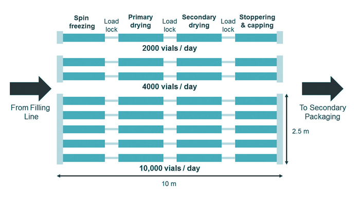 In a conventional freeze-dryer, sublimated ice and desorbed water is collected using cryogenic ice condensers. In the new continuous approach, an appropriate condenser system is used to continuously remove the condensed water. The vial throughput can be increased simply by adding parallel lines in the continuous freeze-drying technology modules, as schematically shown in Figure 4.