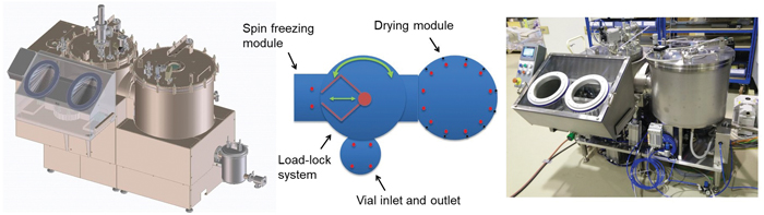 In the GMP-like engineering prototype, all process modules are integrated, and freeze-drying is executed in continuous fashion (Figure 6). This prototype is engineered around the implementation of needs to create and keep a sterile environment by choosing the proper materials and design principles.