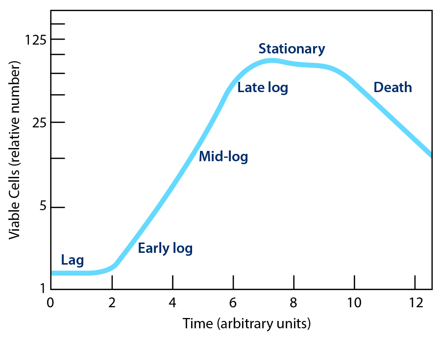 The classical description of the growth phases of a microbial culture is divided into four phases: lag, log, stationary, and death (Figure 1). These distinct phases are apparent when cell counts or optical density are plotted against incubation time. An understanding of these phases is necessary to produce suitable inoculums, which are briefly discussed.