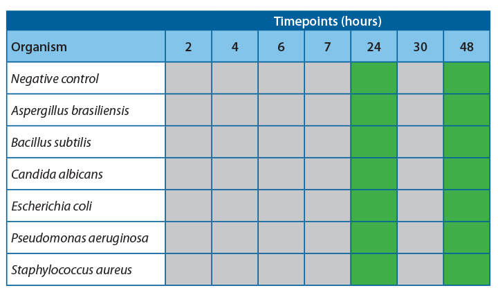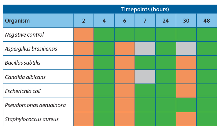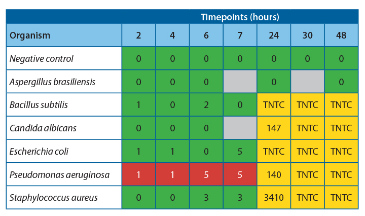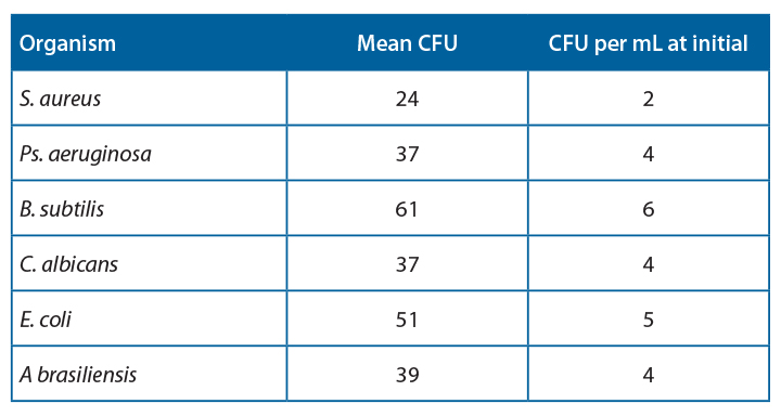 Samples were prepared and were inoculated with a target inoculum level <100CFU/100mL “product”. The organism panel included Staphylococcus aureus, Bacillus subtilis, Pseudomonas aeruginosa, Escherichia coli, Candida albicans and Aspergillus brasiliensis. These were selected to represent the range of flora that may be observed during preparation: human skin commensal, common environmental isolate, waterborne organism, and environmental yeasts and moulds. The organisms also represent the range of microorganisms within the environment: Gram-positive cocci, Gram-positive spore-forming rods, and Gram-negative bacteria.