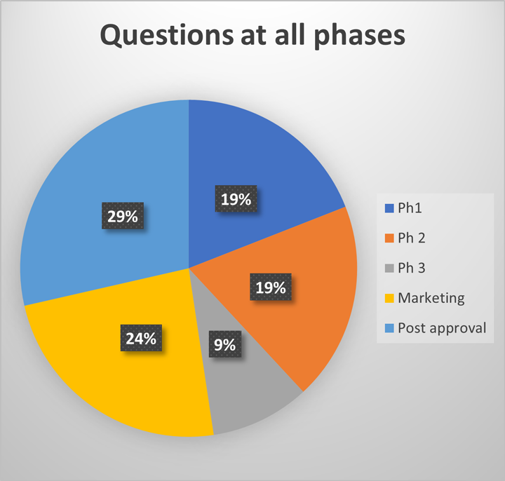 During both clinical trial and marketing applications, regulatory agencies request additional information to support the in-use hold time of a product within the clinical administration environment. A review of regulatory questions at AstraZeneca over the past four years demonstrates that these questions come from regulators all around the world, at all phases throughout a product life cycle (see Figures 1 and 2).